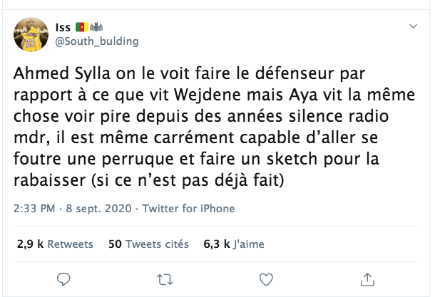 Chose qui a deplu sur twitter, les twittos reprochant à Ahmed Sylla de mettre toute cette energie en défendant cette chanteuse alors que la chanteuse à succès Aya Nakamura, chanteuse qui domine la scène musicale Francaise depuis deux ans n'a jamais eu un soutient de sa part. Les twittos ne sont pas en désacord avec le fait que Ahmed Sylla defende Wejdene mais sont vraiment choqué car Aya Nakamura, femme noire, ce n'est pas un secret a subit de la mysoginoir, du mepris, des attaques, etc etc sur les resaux sociaux depuis des années.. Combien de fois Aya Nakamura n'a pas été en TT sur twitter ? elle a fait enormement de bad buzz sur twitter parfois pour les mêmes critiques que Wejdene, c'est à dire qu'elle fait soit disant de la merde, mais les attaques contre Aya Nakamura sont allées plus loin, jamais Ahmed sylla ne lui apporté son soutient, les twittos ont décidé de donner leur avis, d'où cette sauce où il est monté en TT