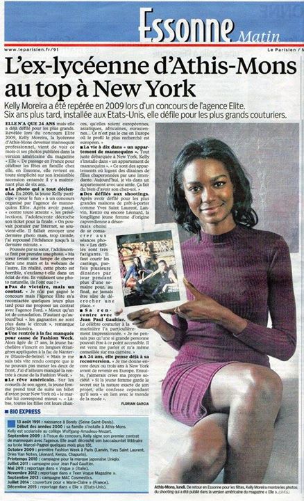 elle s'appelle kelly moreira,elle est jeune,elle est d'origine africaine plus précisemment elle vient du cap vert et a vécu à paris dans l'essone ou elle avait même commencé la fac avant que sa vie ne bascule.en 2009 sur les coneils de sa soeur elle va poster ses photos sur le site de myspace pour participer au concours Elite Model.malgré ses photos d'une tres mauvaise qualité,ses photos seront retenues et la jeune femme va tout de même arriver en demi finale du concours Elite model 2009.malgré ce coup d'arret,la chance sera de son coté car les responsables de l'agence Elite Model vont voir en elle un potentiel et vont donc l'envoyer participer à un casting de lanvin.sans book ni shooting,la jeune femme sera quand même retenue et depuis la jeune manequin enchaine les defilés,elle a defilé pour yves saint laurent,kenzo,leonard etc et aussi a fait plus couvertures de beaucoup de magazine,EllE us,Marie claire etc..malgré sa notorieté,la jeune femme n'a pas oublié ses racines,elle revient souvent dans l'essone pour voir sa famille..souhaitons là bonne chance