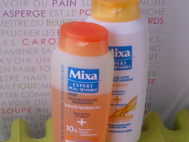 voici les produits de la marque MIXA que j'utulise depuis quelques temps,j'etais tenté par tester l'huile de douche.j'aime beaucoup les produits Mixa,j'ai grandi avec,j'ai utulisé mon 1er lait mixa je devais avoir 14 ans et c'est ya tres tres longtemps,meme si ces produits ne sont pas bio,mais moi j'aime bien ces produits,en plus leur prix est accéssible à tous.j'ai donc testé ces 2 produits de douche